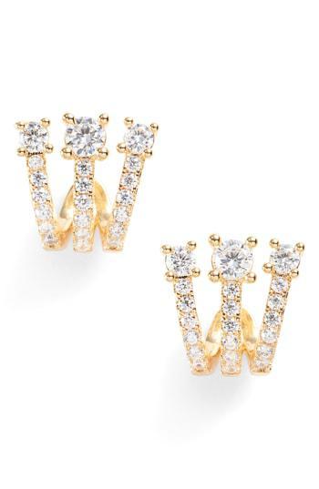 Designed to fan your earlobe in soft shine, these glinting ear huggies have three rows of metallic lines, each studded with sparkling cubic zirconia Style Name: Melinda Maria Katherine Crystal Huggie Earrings.